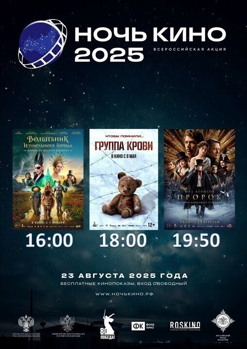 В кинотеатрах состоятся некоммерческие показы хитов российского кинопроката: военной драмы в честь 80-летия Победы в Великой Отечественной войне — «Группа крови», семейного фэнтези «Волшебник Изумрудного города. Дорога из жёлтого кирпича» и музыкального байопика «Пророк. История Александра Пушкина».