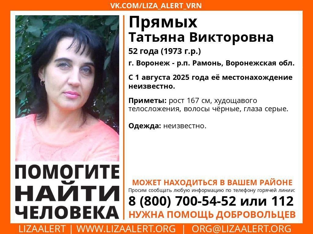 Внимание! Помогите найти человека! Пропала #Прямых Татьяна Викторовна, 52 года. г. #Воронеж - р.п. #Рамонь, #Воронеж'ская обл. С 1 августа 2025 года ее местонахождение неизвестно. Если вы обладаете какой-либо информацией о пропавшей, просьба позвонить по номеру телефона горячей линии отряда 88007005452 (бесплатно по РФ) или 112. ⚡️Подпишись на «Медиа-Х Воронеж»