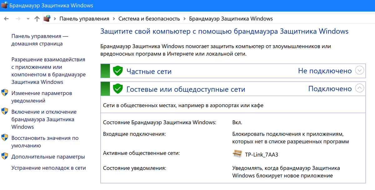 В операционной системе Windows встроенный брандмауэр. Его настройки можно увидеть, открыв «Пуск» на компьютере, в строке поиска введите запрос «Брандмауэр Защитника Windows». Откроется окно, где можно увидеть настройки брандмауэра.