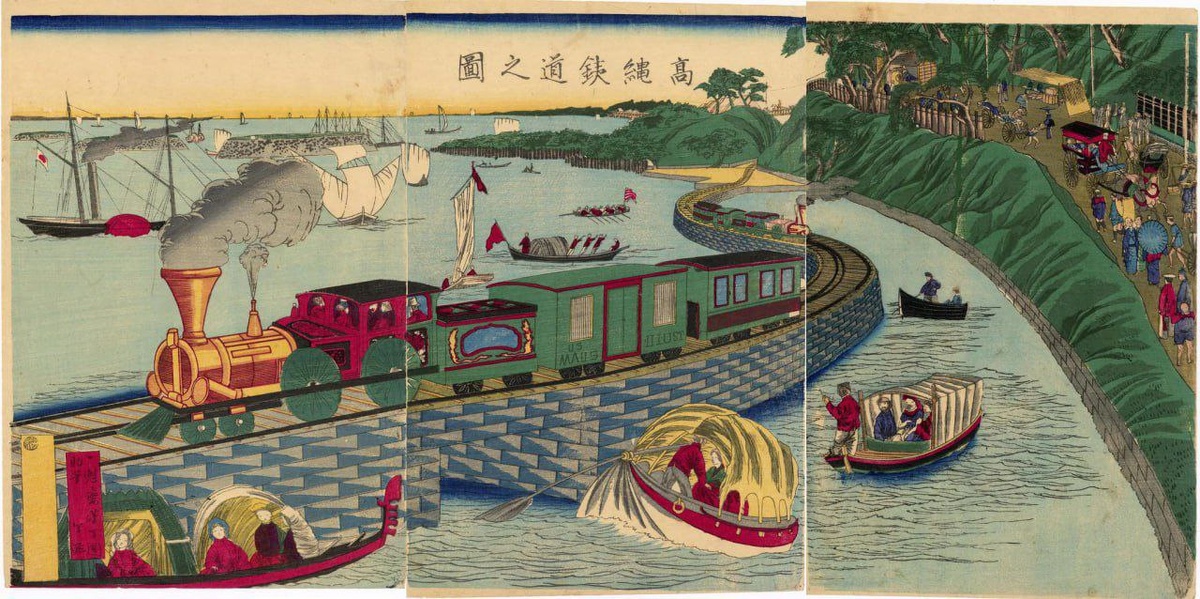 🍢 В эпоху Мэйдзи (конец XIX — начало XX века) Япония начала открываться для иностранного влияния и всего за несколько десятилетий адаптировала множество достижений Европы и США. В крупных городах стали появляться западные элементы в моде и архитектуре, а по всей стране проложили железнодорожные пути. Одним из символов Токио стала первая железная дорога с паровозом. Художник Цукиока Ёситоси изобразил её на ксилографии 1871 года, окружённую людьми в европейских нарядах: мужчины в цилиндрах и женщины в роскошных юбках и чепцах. В этот период Ёситоси также создал несколько других произведений с индустриальными мотивами, включая изображение поезда на набережной в заливе Синагава. #живопись #искусство #культура #азия #ксилография #япония #мэйдзи #ëситоси @ЛитМузБес