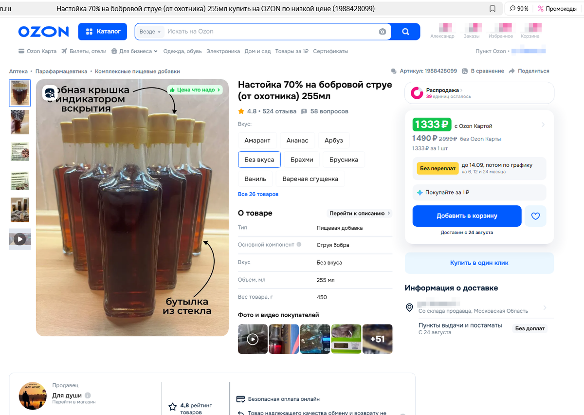 - Вот такое объявление о продаже настойки струи бобра на достаточно известном маркетплейсе. Рубрика "Аптека". Объём жижи - 255 мл за 1333 рубля.