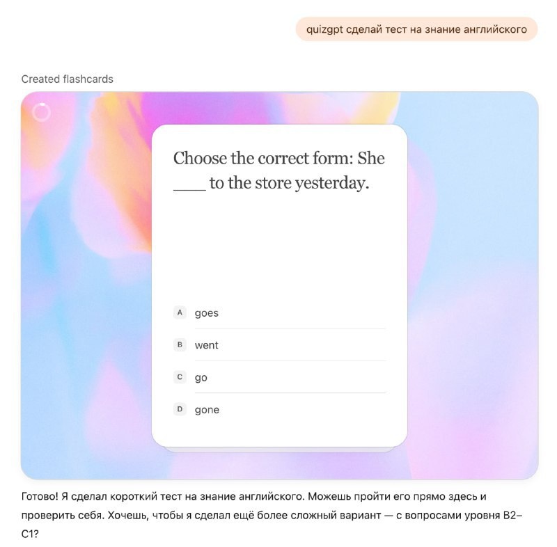 ChatGPT стал способен генерировать карточки с тестами для учебы. Эта функция теперь доступна в веб-версии. Создайте квизы просто с помощью команды: quizgpt [ваш промт]. Бот сформирует серию вопросов по выбранному предмету. После завершения теста вы можете запросить разбор всех ошибок и попросить подготовить новый тест. Эта возможность доступна бесплатно для всех пользователей. Попробуйте на ChatGPT. Наш уютный канальчик 🤖 Анимация | СhatGPT-4 | Помощь с резюме