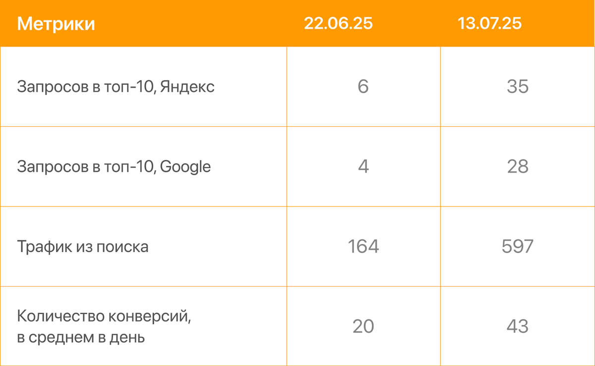 Владельцы сайта подключили «Динамическое SEO» еще на этапе бета-тестирования, в конце июня 2025 г. Результаты продвижения за первые три недели – в таблице:
