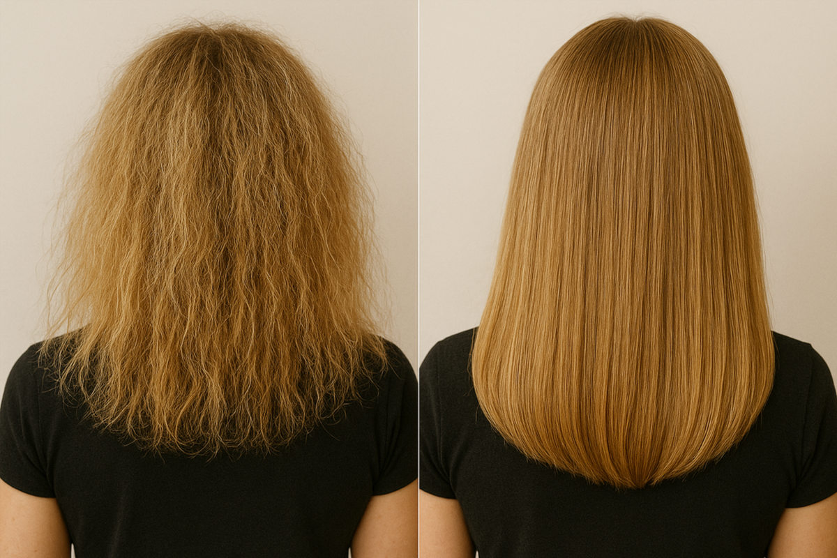 Клиентка: 34 года, волосы после многократной химической завивки и окрашивания.