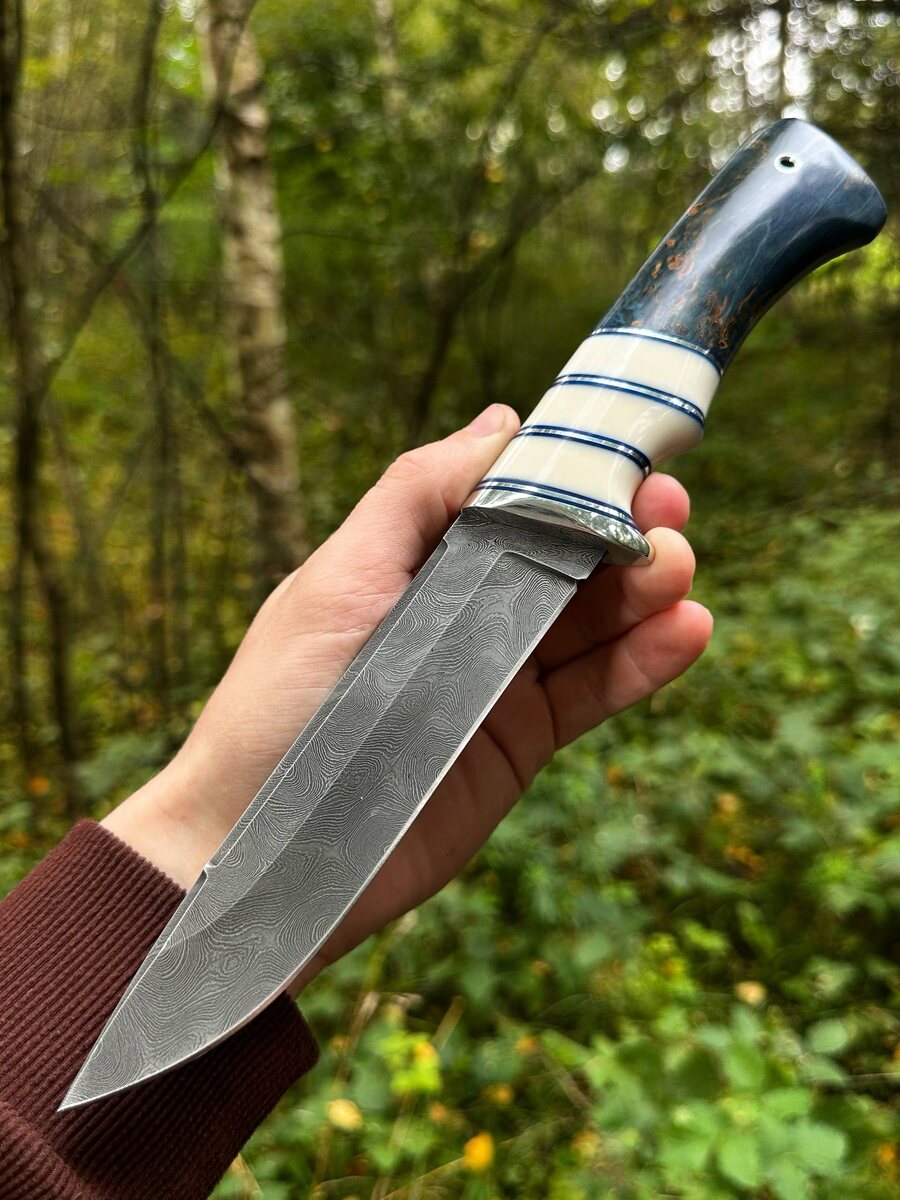 🔹 Нож "Вепрь" из дамасской стали — для ценителей уникального! 🔹 В наличии — эксклюзивная модель: - *Клинок*: дамасская сталь, кручёная, 960 слоёв! Твёрдость — HRC 62. Лёгкая вогнутая линза спусков, фальшлезвие на обухе, бритвенная заточка — режет легко и чисто. - *Рукоять*: стабилизированная карельская берёза (синяя) и белый акрил — не только красиво, но и долговечно! - *В комплекте*: ножны из натуральной кожи. 💥 Цена по акции: 8040 руб. (Обычная цена — 10 260 руб.) Дополнительно — можем изготовить формованные ножны из кожи растительного дубления (+ 8 000 руб.). Для кого подойдёт: - Охотники, рыбаки, туристы — надёжный помощник в любом походе. - Для подарка — ценителям ручной работы и оригинальных вещей. 📲 Заказать просто: - Пишите @Nazarklinokbot - WhatsApp: [ссылка](https://wa.me/79101343831) - Телефон: +7 910 134-38-31 Успейте — нож в наличии. #нож #дамасскаясталь #ручнаяработа #подарок #кузницаназарова