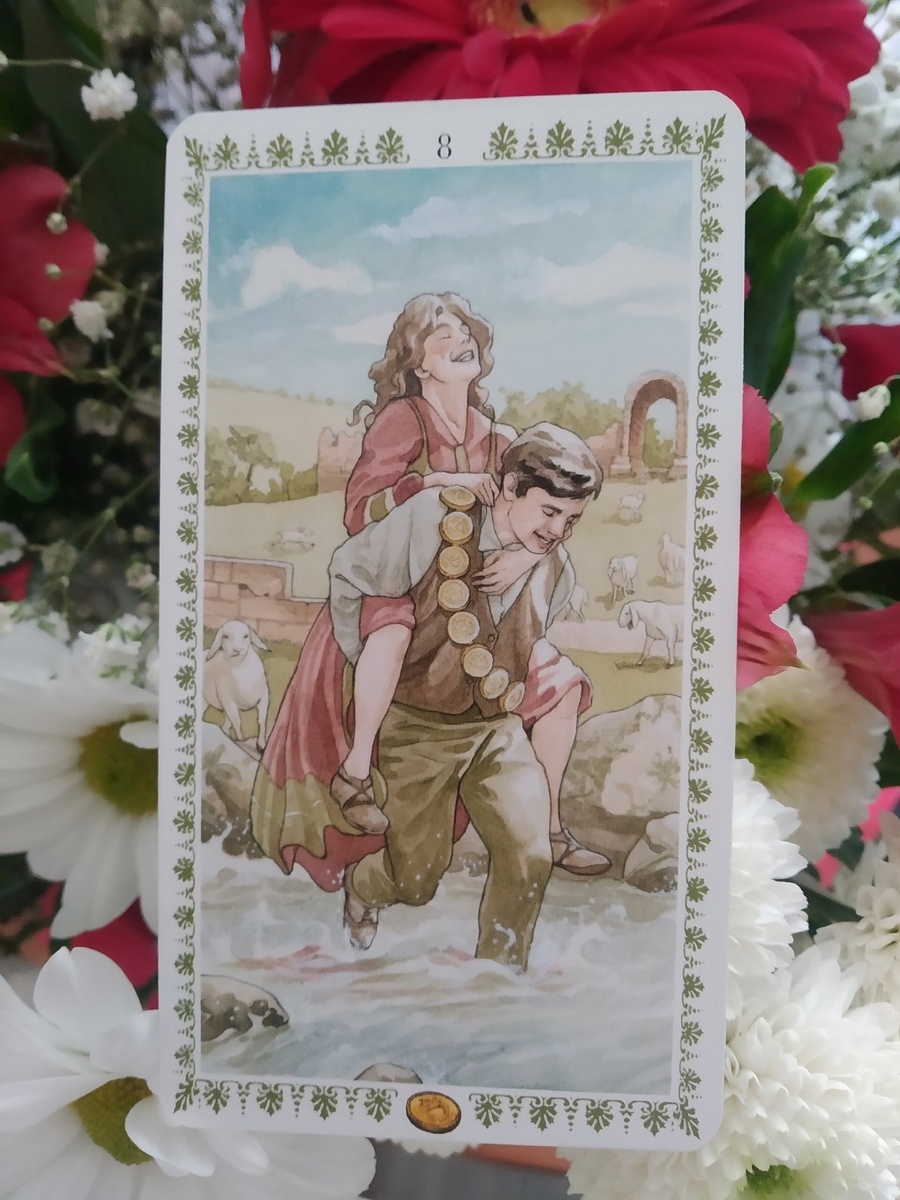 Здравствуйте! Выпавшая карта на день – 8 пентаклей из колоды Романтическое Таро. Сюжет этого аркана, на мой взгляд, слабо соотносится с традиционными значениями карты. По крайней мере я не увидела здесь рабочего настроя и увлеченности полезным трудом. Скорее всего тут делается акцент на том, что совместная деятельность сближает людей, помогает им получше узнать друг друга и укрепить отношения. Действие 8 пентаклей происходит в погожий летний денек. Перед нами ручей с каменистым берегом и зеленая полянка. Среди невысоких кирпичных строений прогуливаются белые овечки, а чуть дальше виднеется арка – символ перехода. На переднем плане - пастух и пастушка, но их внимание сосредоточено друг на друге, а не на стаде, которое они, по всей видимости, пришли пасти вместе. Мужчина в коричневом жилете и зеленых штанах (прагматизм и рассудительность) несет на закорках женщину в красном платье (страстное желание), чтобы она не промочила ноги. Оба веселые, смеющиеся. Она довольна тем, что «оседлала»