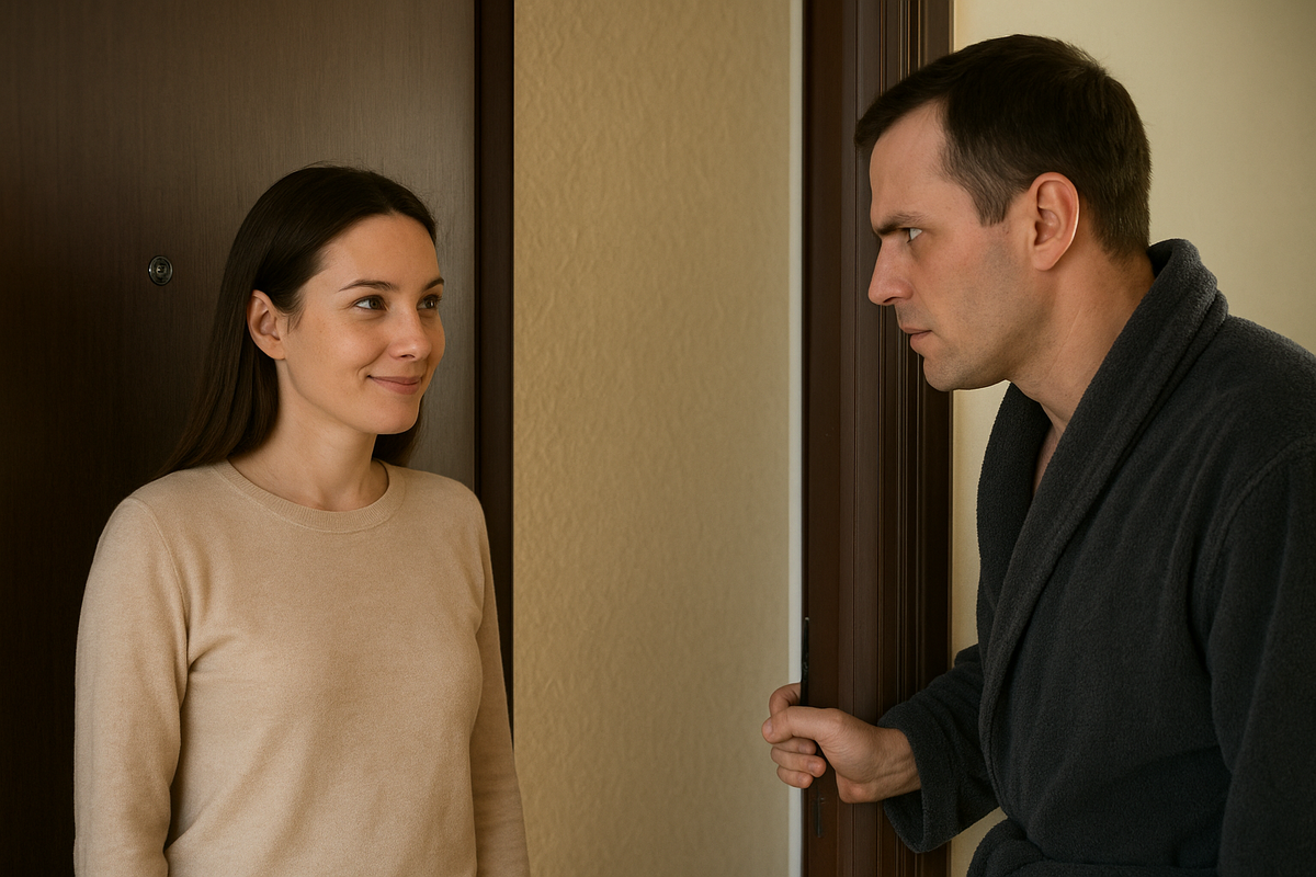 Дверь распахнулась, и на пороге появился мужчина, которого Олег никогда раньше не видел. Высокий, плечистый, с тяжёлым взглядом, в домашнем халате и тапочках. Он смерил Олега глазами и недовольно нахмурился.