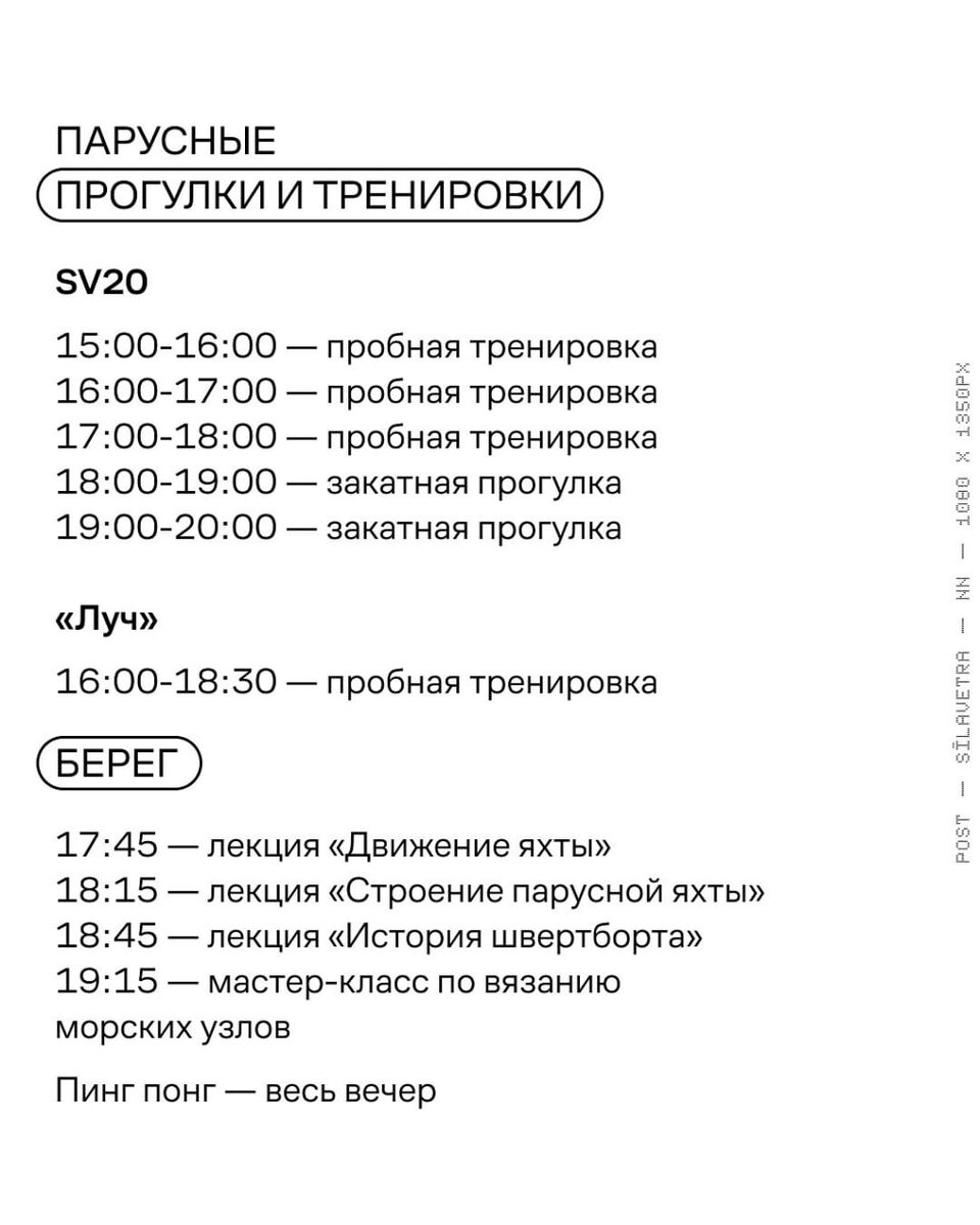 ⛵️ День открытых дверей в Силе ветра Отличная возможность попробовать яхтинг, если давно откладывали или сомневались. 🩵 Пробные тренировки для всех желающих, прогулки на закате со скидкой, лекторий и игры в пинг-понг. 24 августа, 15:00-20:00 Набережная Гребного канала, 109Г 👉 Подробное расписание и ссылки на регистрации — здесь.