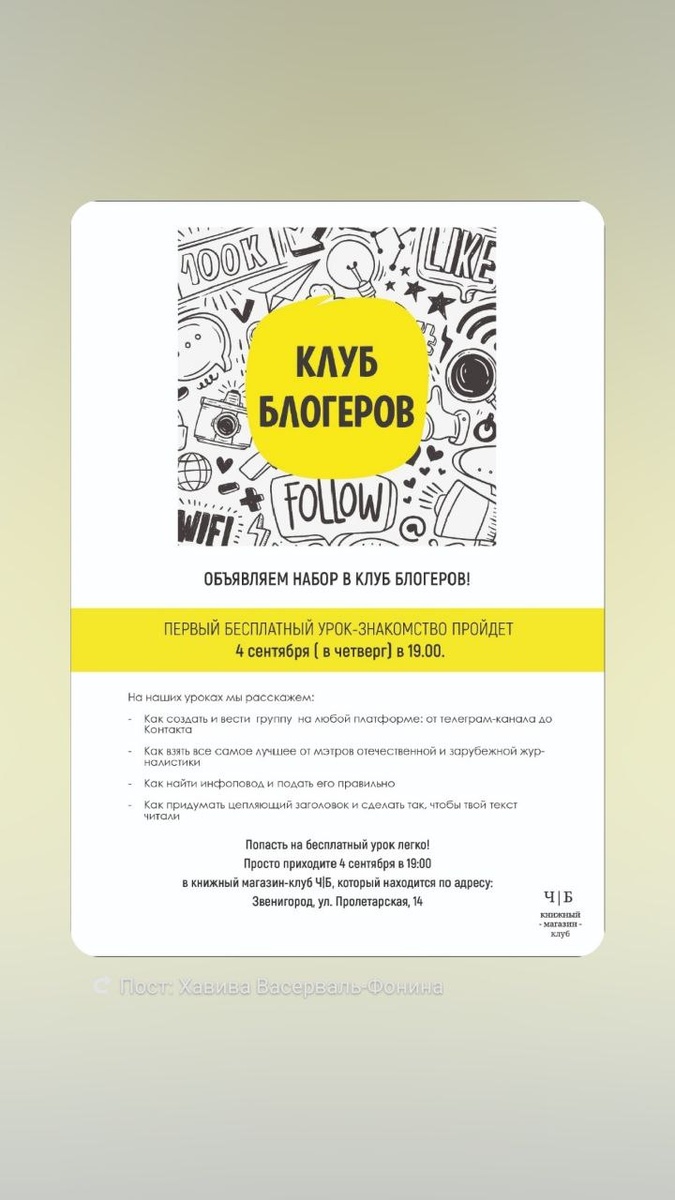 Если ты желаешь научиться мыслить креативно и воплощать самые оригинальные идеи в текстах и видеосюжетах, приходи в книжный магазин клуб "Ч/Б". Мы открываем набор в школу блогеров. Блогинг — не про случайный взлет, а знание возможностей медиа-пространства и реальная профессия. Успешный блог — результат регулярной работы по определенной стратегии. Что тебя ждёт на нашем курсе? 💯 Ты узнаешь, чем отличается телевизионный текст от заметок в газете и на новостном портале 💯 Научишься писать в разных жанрах журналистики 💯 Познакомишься с интересными спикерами: репортёрами, редакторами и блогерами Попасть на занятие ты можешь легко. Первый бесплатный урок-знакомство пройдёт уже 4 сентября (в четверг) в 19.00. Записывайся на занятие прямо сейчас: 89032208622 До встречи в книжном магазине-клубе "Ч/Б" по адресу: ул. Пролетарская, д. 14