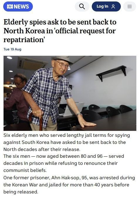 Шестеро северокорейских шпионов, отбывших длительных тюремные сроки в Южной Корее и выпущенные на свободу, просят репатриировать их на родину. Все это глубокие старики в возрасте от 80 до 96. Находясь в Южной Корее на нелегальном положении, они занимались разведывательной деятельностью и шпионажем в пользу КНДР, были раскрыты и каждый по нескольку десятилетий просидел в тюрьме. Одному сейчас 95 лет, он был взят в плен еще во время Корейской войны 1950-1953 гг. и более 40 лет просидел за решеткой. Никто из этих 6 человек не отказался от коммунистических убеждений . Вопрос: как так, Северную Корею же представляли как вселенское зло...