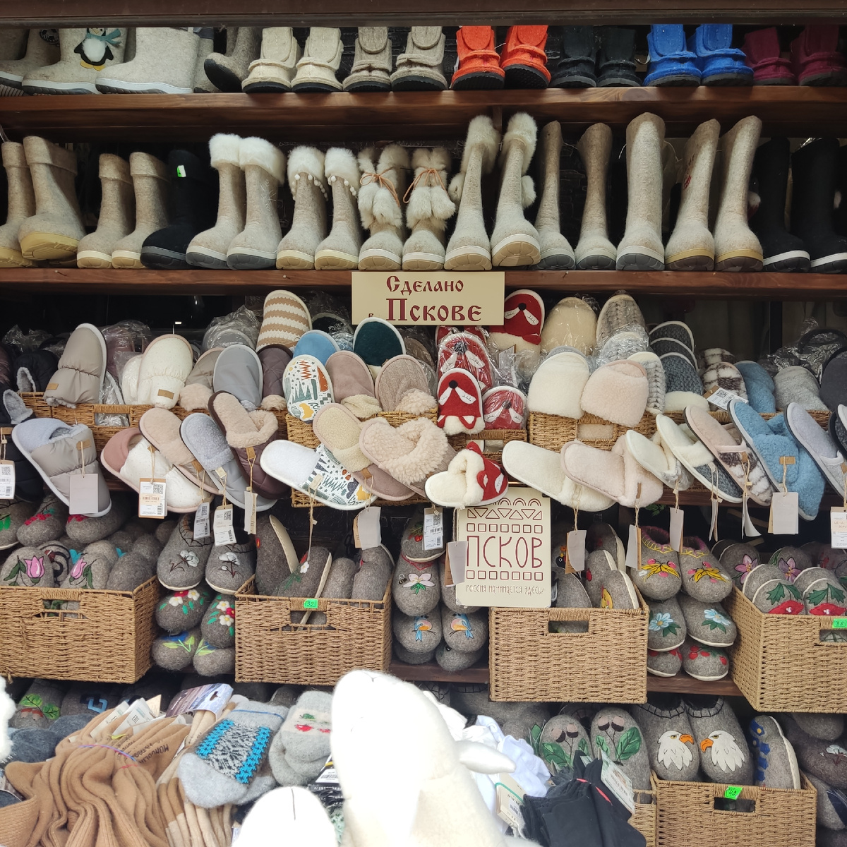 Многие из нас любят привозить из путешествий подарки и сувениры себе, друзьям и близким. Я совсем недавно перестала болеть этой болезнью: когда на стенах не осталось места для сувенирных тарелок из разных городов, на холодильнике стало некуда лепить магниты и уборка на полках стала тяжким трудом в связи с несметным количеством различных сувениров на них. Но если уж хочу привезти что-то, то захожу на Вайлдбериз - там есть все то же самое, только гораздо дешевле. А вот по сувенирным лавкам все же хожу - интересно же! В Пскове как-то подобные лавки на глаза не попадались, а вот в поездке в Печоры-Изборск на местную продукцию посмотрела. Сейчас и Вам покажу. Ну и в первую очередь, в Печорах на глаза попались теплые изделия местного производителя. Оно и немудрено: Псков - город северный все же. Сбитни Столбушино покупала неоднократно в разных местах (раскрученный товар), но только здесь узнала, что производство натуральных продуктов питания "Столбушино" находится в Пушкинских Горах