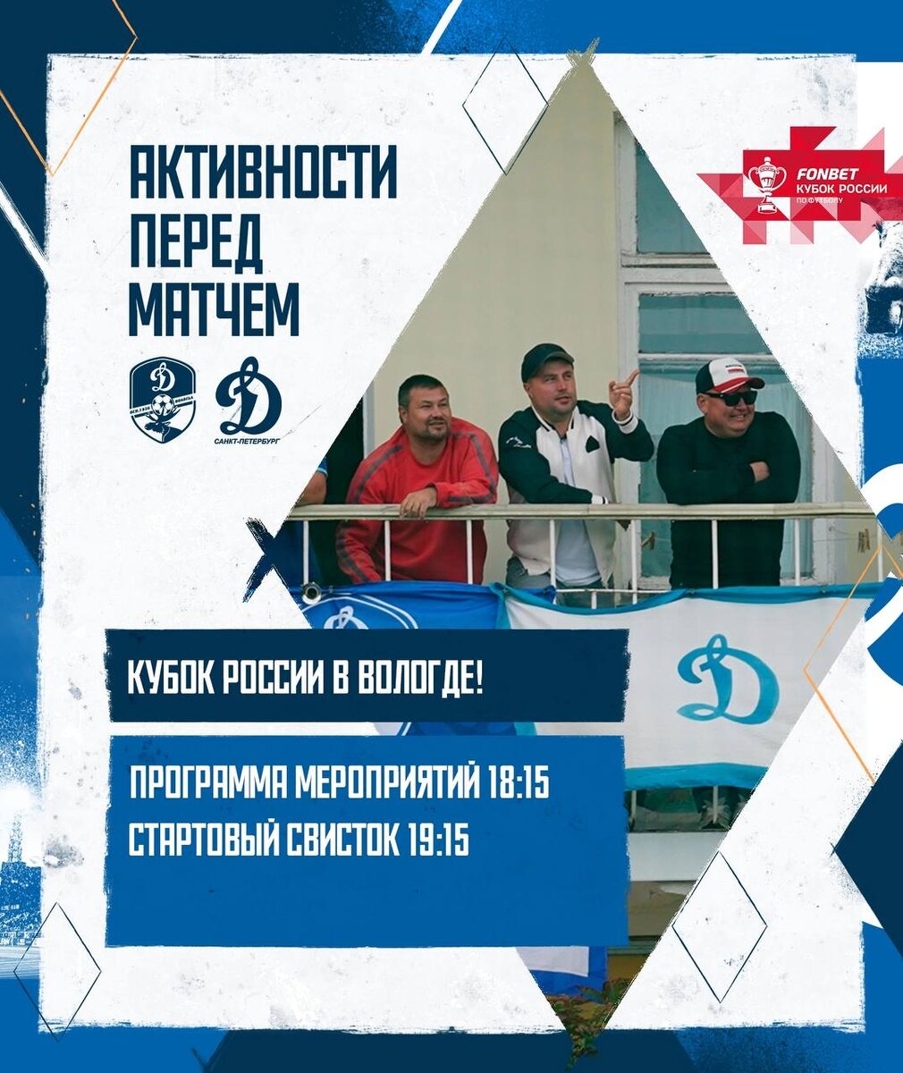 Завтра на «Динамо» будет по-настоящему жарко 🔥 🏆 Начинаем свой путь в FONBET Кубке России и рассказываем какие активности ждут тебя перед матчем с «Динамо» (Санкт-Петербург) Изучай программу матчдея, зови собой близких и приходи сам! 💙 Ждём всех на стадионе в центре Вологды: clck.ru/3NeScX 🎟️ @dynamovologda