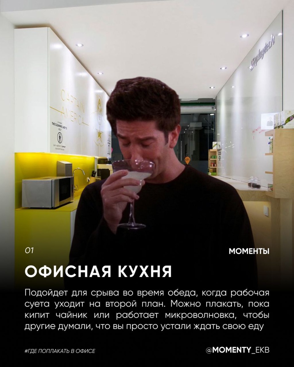 Ваши эмоции — это нормально, даже если они накрывают в неподходящий момент. Не сдерживайтесь и дайте волю чувствам, а чтобы сделать это эффектно — загляните в наши карточки. Собрали топ комфортных мест на работе, где можно поплакать. Протестировано редакцией🥺 (шутка) #Моменты_мемы Подписаться 🔸 Обсудить