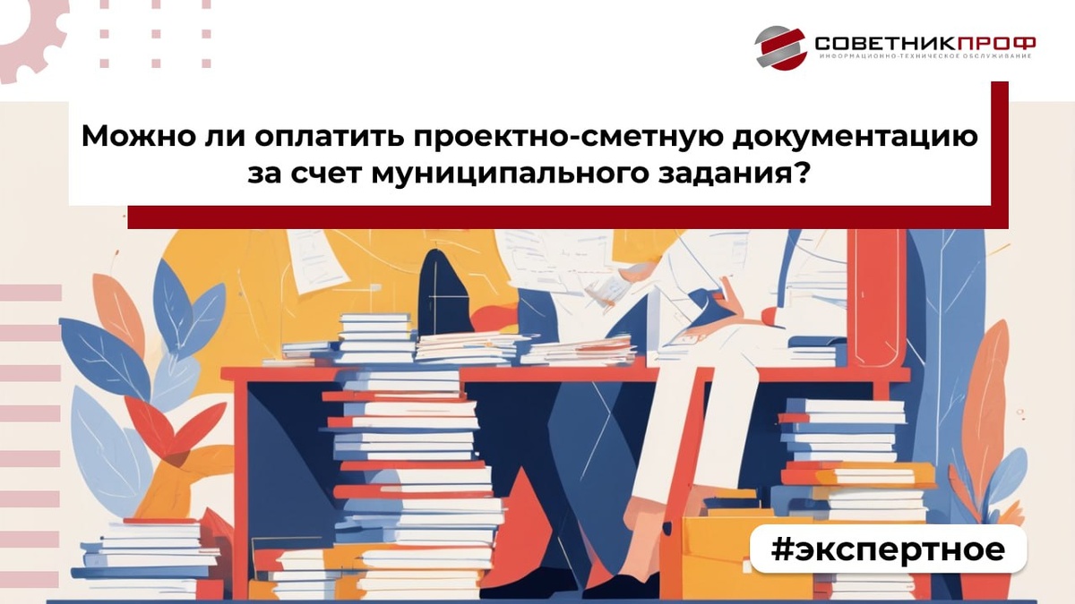 ✔️ Консультация от экспертов СоветникПРОФ ВОПРОС: Можно ли оплатить проектно-сметную документацию за счёт муниципального задания? ОТВЕТ: Нет, такая оплата не допускается. Средства на выполнение муниципального задания могут использоваться только на оказание муниципальных услуг (образовательных) и содержание имущества школы. Проектно-сметная документация обычно требуется для капремонта, реконструкции или строительства, а эти мероприятия не входят в муниципальное задание. ✉️ Получить демо-доступ к Системе СоветникПРОФ или задать свой вопрос можно по ссылке. Подписаться на СОВЕТНИК ДИРЕКТОРА и ЗАВУЧА • #экспертное@sovetnikprof_school