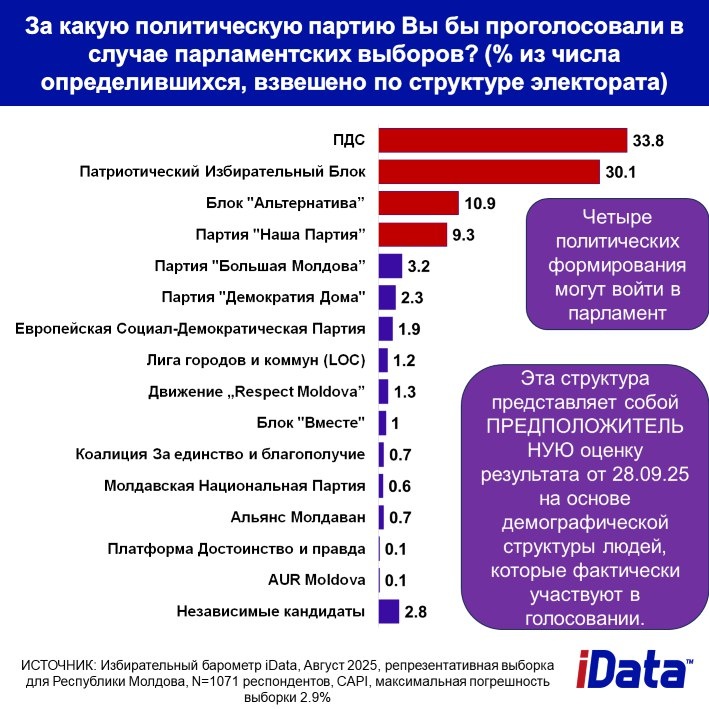 Новое политическое исследование. Согласно последнему опросу iData, проведённому с 7 по 16 августа 2025 года среди 1071 респондента (погрешность ± 2,9%), позиции на политической арене Молдовы заметно изменились. На первом месте остаётся Партия действия и солидарности (PAS), за которую готовы проголосовать 33,8% определившихся избирателей. Однако в непосредственной близости к ней расположился Патриотический избирательный блок (BEP), который набирает уже 30,1%. Таким образом, разрыв между правящей партией и оппозицией сократился до минимальных значений, что делает расклад на будущих парламентских выборах крайне напряжённым. На третьей позиции - Блок «Альтернатива» с результатом 10,9%, а за ним следует «Наша партия» с 9,3%. Согласно опросу, именно эти четыре политических формирования могут пройти в парламент. Остальные политические силы демонстрируют поддержку ниже электорального порога. Среди них: «Большая Молдова» — 3,2% «Демократия Дома» — 2,3% независимые кандидаты — 2,8% остальные пар