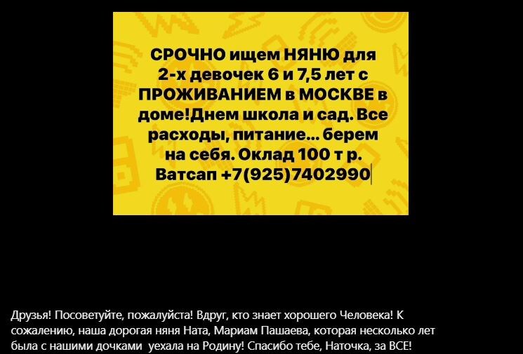 Его крик души, а точнее, объявление, разлетелось по всем социальным сетям. Срочно! Именно так, с восклицательными знаками. Срочно ищут няню для двух маленьких девочек — одной 6, другой 7 с половиной.