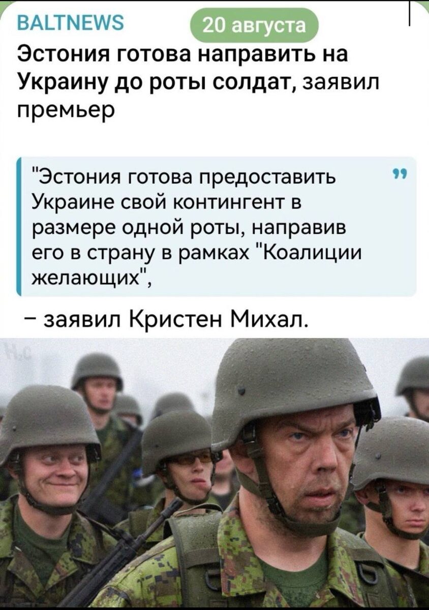 Премьер-министр Эстонии Кристен Михал заявил о намерении направить на Украину целую роту эстонских военных Смешно? А вот простым эстонцам не очень – их руководство решило ради поддержки "незалежной" поставить под удар даже собственную обороноспособность. Тем не менее, в "коалиции желающих" продолжают толпиться те, кому "и хочется, и колется, и мама не велит"… В очереди давно стоят Великобритания, Франция, Канада, Австралия, Чехия, теперь вот Эстония и Литва. Никак не определятся немцы и поляки. Что интересно, все эти так называемые "желающие" рассчитывают исключительно на "небоевую миссию" на Украине, видимо надеясь, что российские ракеты и "Герани" не будут атаковать "миролюбивого" противника. Тем не менее, как бы кто мужественно из них не сотрясал воздух, реальные шаги делать не так просто, как кажется. Особенно, в условиях, когда Вашингтон уже не собирается впрягаться за европейцев, оставляя их наедине с возможными последствиями. @iperiodu | @iperiodu_ru x @iperiodu_ua | Подпи