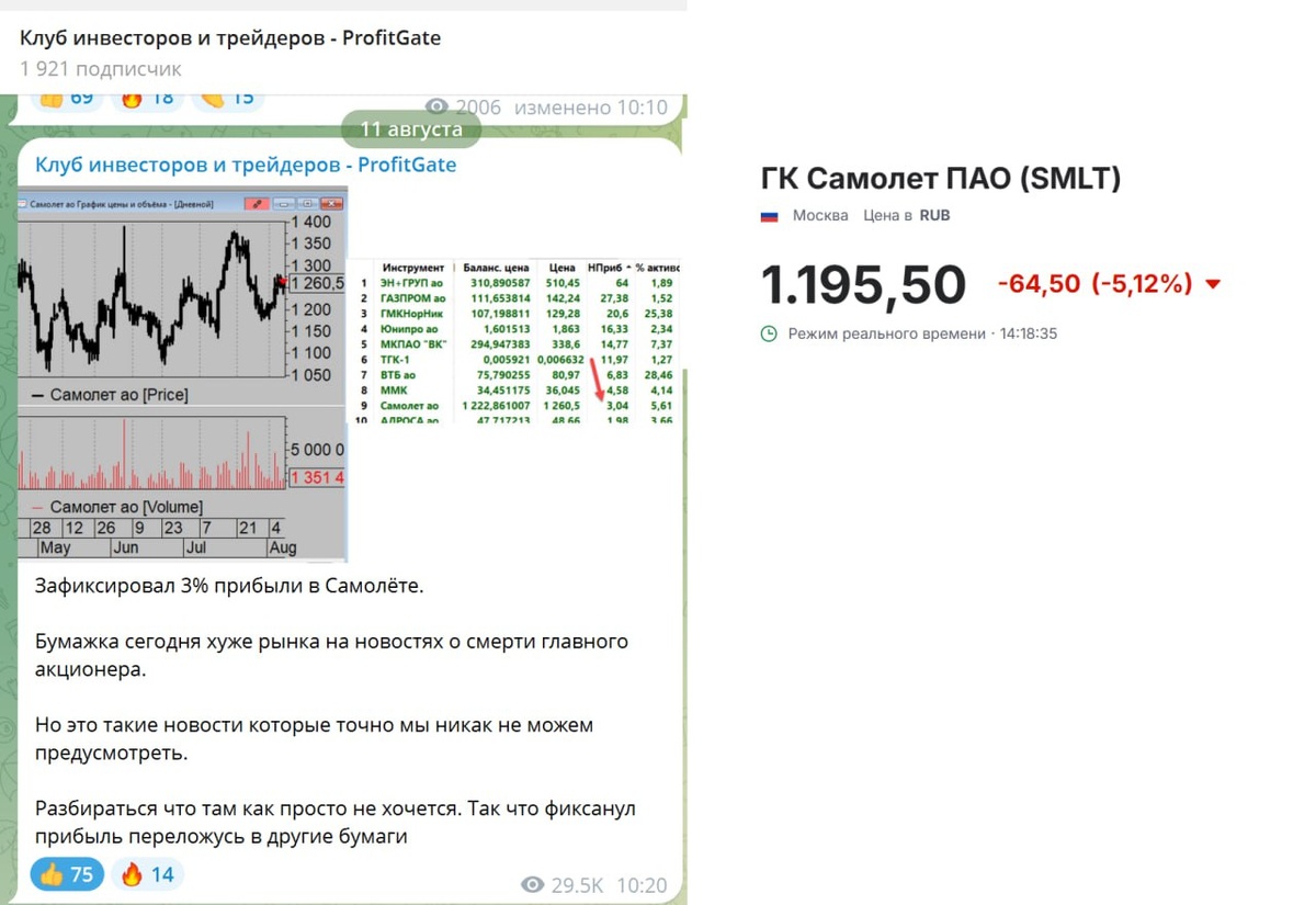 ☝️Сегодня рушились акции компании Самолёт, на "новостях", самолёт я скинул ещё 11 августа. Интересно что несколько дней назад застройщиков разгоняли, были массовые сигналы от различных каналов на их покупку. ☝️Чем отличается наш канал. Никогда не пишем о сделках задним числом. Даже если позиция идёт против нас. Не переобуваемся в воздухе и не обманываем подписчиков :) Всем кто спрашивал по застройщикам. Подобные проливы как сегодня, следует скорее покупать ИМХО похоже на то что было в ТГК-14. Но у самого у меня их сейчас нет. Торгую совсем другую историю.