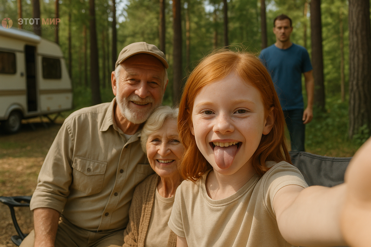Селфи открылось — Лиза с веснушками и рыжими кудряшками хохочет в камеру. На заднем плане — Николай и Галина, сидящие в креслах возле своего скромного автодома на берегу озера. Марину окатила волна благодарности: как хорошо, что у Лизы есть такие заботливые дедушка с бабушкой. Она увеличила фотографию, чтобы рассмотреть детали — и тут её взгляд наткнулся на чужака.