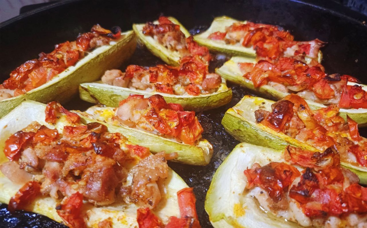 В получившиеся лодочки выкладываем сначала рубленное мясо, сверху измельченные помидоры. Следом заливаем яйцом и ставим в предварительно разогретую до 200 градусов духовку. Для молодых кабачков достаточно запекания в течние 30-40 минут.