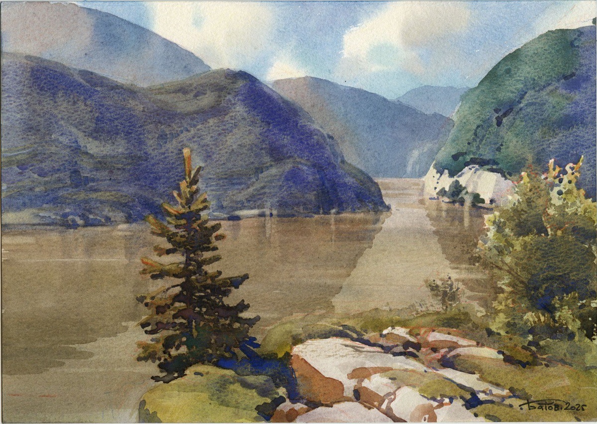 20250805 Ландшафт / Riverscape / 21x30 см. Конструирование пейзажа. Constructing an imaginary landscape. Краски Pinax Extra. Бумага 100% хлопок Палаццо 300 гр. Акварельные упражнения по вторникам (Москва, Садово-Кудринская 25) "Арт галерея Москва". #акварель #живопись #watercolor #pinax_extra #palazzo_watercolor_paper #Изо #watercolorsketch #ArtBatDiversion #artLesson #мастеркласс