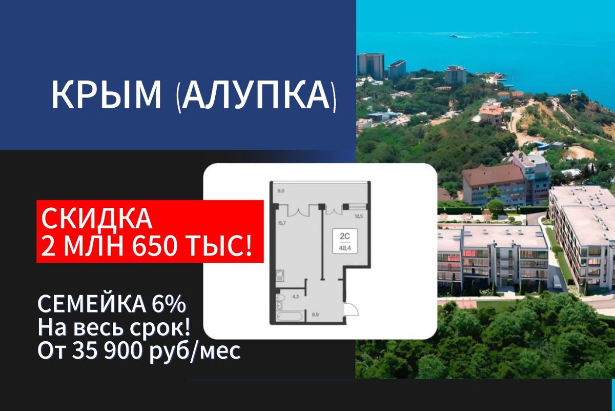 Новостройка в Алупке (Крым) • Дом сдан • Площадь 48,4 м² • Цена по Акции 13 100 000 ₽ вместо 15 750 000 ₽ • Семейная ипотека 6% на весь срок, без удорожания • Ежемесячный платеж от 35 973 руб. Акция 🕰 Звоните или пишите: +79184245419 +79282915705 Лана 🤝 WhatsApp: https://wa.me/message/AF3WFFTBMH5EK1 #новостройкакрым #жккрым #семейнаяипотекакрым #переездвкрым #недвижимостьалупка #переезднаюг #житьуморя #жкалупка #алупка