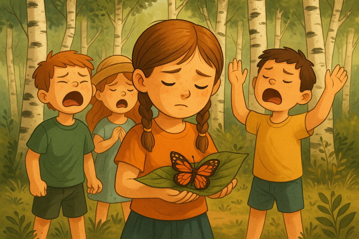А воспитатели, как каменные изваяния, стояли на краю песочницы, не в силах ни говорить, ни двигаться. А всё началось с бабочки. Она лежала под берёзой, в тени, как будто просто уснула. Но я поняла: нет, не спит. Она умерла. А значит нужны похороны. Но не простые, а по всем правилам. Как у богатырей из былин, которые мне недавно читала мама: с ложем, плакальщицами, воем и шествием. Раз уж слово «выли» так глубоко отпечаталось в памяти, мы решили, что теперь умеем и обязаны это применить. Я собрала команду.