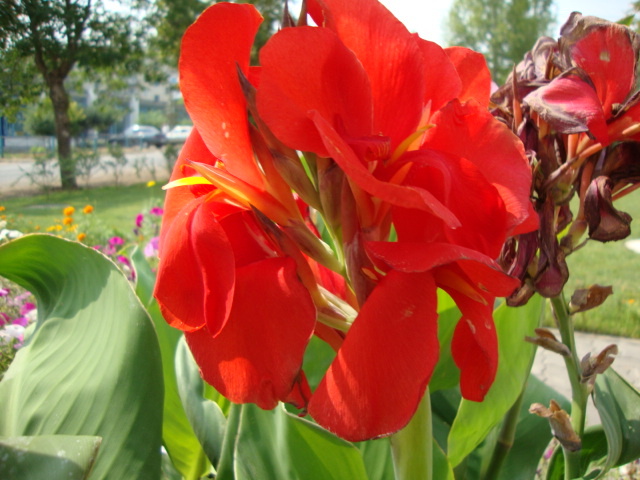 А некоторые , я бы даже сказала, и вовсе экзотика в наших краях. Начну с известного, но не популярного растения наших садов -это Канны. Вот скажите, почему их редко можно встретить в садах? Даже в общественных клумбах это редкий гость, не то , что раньше. Ну всем же хороши и статью и цветом и совсем неприхотливы. Может просто тем, что не научились их хранить? Я каждый год сажаю этих великанов, потому что люблю. И каждый год терплю фиаско с их хранением. Благо , у меня есть свой продавец и каждую весну у меня обновление. Стоят они не дорого. Но, последние года два, стали продавать карликовые канны. Я сначала даже обрадовалась, что не будет таких гигантов, а листья и цветы будут, как прежде, украшать мой сад. Не тут -то было! Кустики получились, так себе, да и цветы не слишком украсили. В прошлом году у меня выросло чудо-юдо. Я не могла понять, что это. Оно росло быстро и крупно. Вкоре стало ясно, что это калла появилась из семян. Здесь когда-то они росли. Но процвети она не успела. По