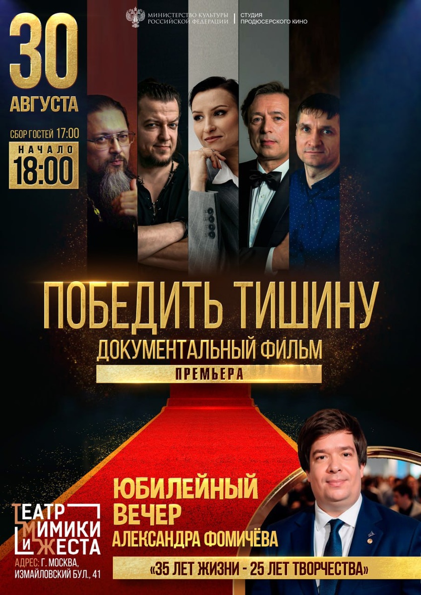 ⚡️30 августа в 18:00 - двойной праздник в Театре Мимики и Жеста! В этот день состоится яркое культурное событие - премьера документального фильма «Победить тишину» и творческий вечер с песнями, танцами и фокусами — вы многое узнаете о жизни Александра Фомичёва. 💳 Билеты на яркий вечер можно приобрести на сайте театра: https://tmig.edinoepole.ru/widget/events/459/event_seats?roistat_id= О фильме «Победить тишину» Этот документальный фильм — не просто картина. Это вдохновляющие истории людей, для которых тишина стала не препятствием, а началом большого пути. Картина создана Студией Продюсерского Кино при поддержке Министерства культуры РФ. Режиссёр и идейный вдохновитель — Александр Фомичёв, человек-легенда, чья собственная жизнь является синонимом преодоления и победы. Герои фильма: • Отец Валентин Терехов — единственный в России глухой священник, совершающий богослужения на жестовом и звучащем языке. • Павел Сахаров — талантливый аниматор, чьи работы покорили YouTube и сердца ми