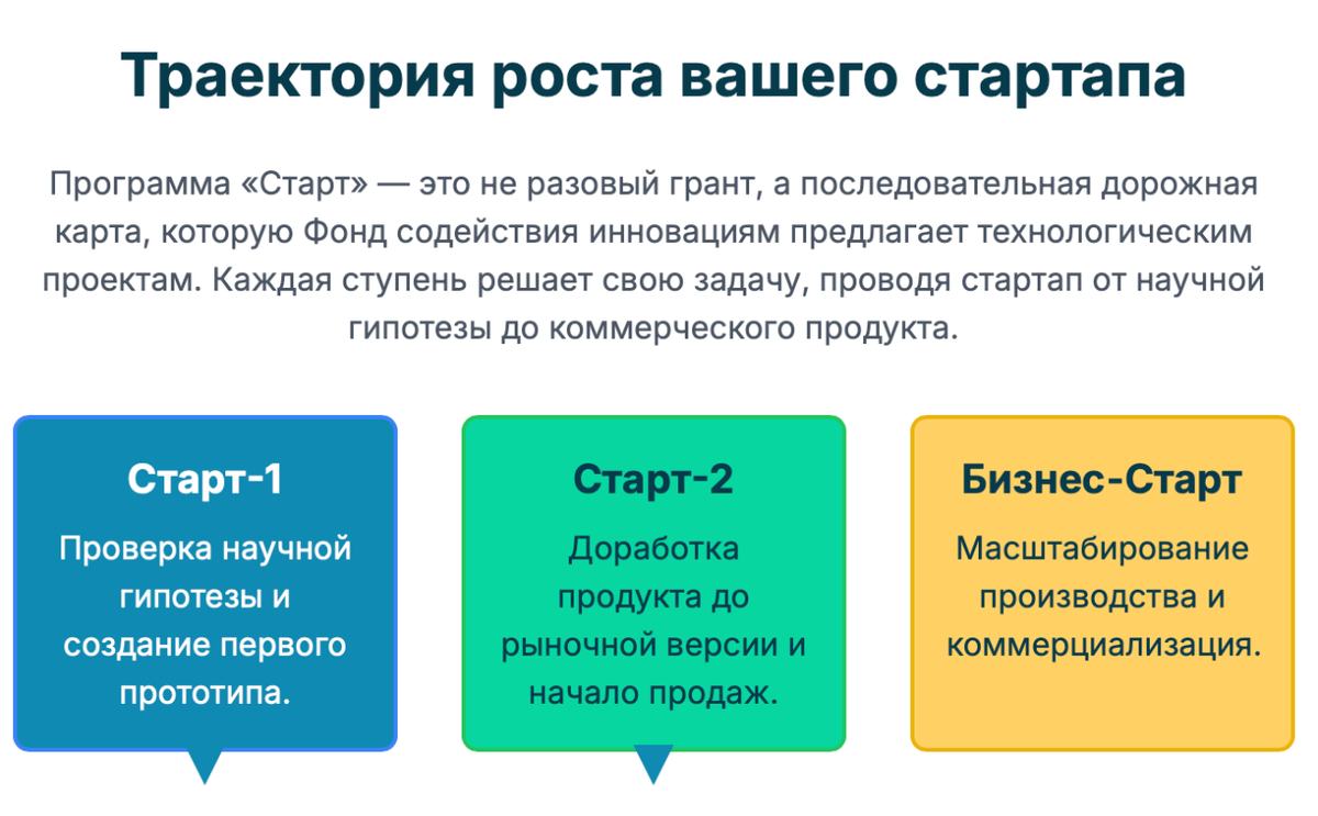 Философия программы заключается в последовательном снижении рисков. Она признает, что на начальном этапе технологический риск (сможем ли мы это создать?) преобладает над рыночным (сможем ли мы это продать?). Поэтому программа разделена на этапы, каждый из которых решает свою задачу. «Старт-1» нацелен на проведение научно-исследовательских и опытно-конструкторских работ (НИОКР) для проверки фундаментальной гипотезы и создания первого прототипа. «Старт-2» предназначен для доработки этого прототипа до полнофункционального образца, готового к первым продажам.2 Этот структурированный подход позволяет проектам постепенно двигаться от лабораторного стола к рынку, получая финансирование на каждом критически важном этапе.
