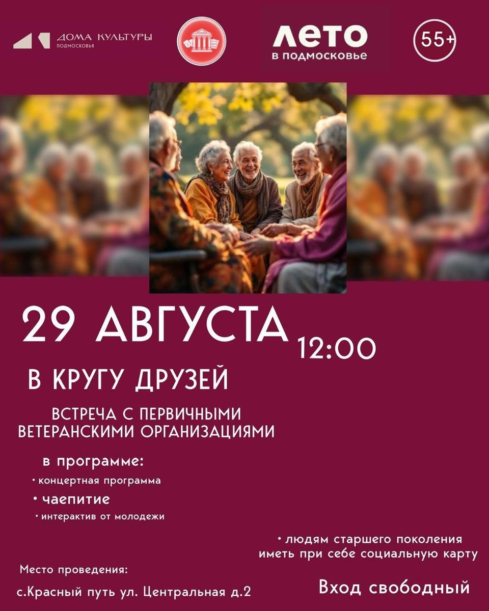 ✨ СДК «Русь» приглашает☝️ «В кругу друзей» - встреча с первичными ветеранскими организациями. В программе: - чаепитие; - концертная программа; - интерактив от молодежи. Вход свободный. Всем людям старшего поколения иметь при себе социальную карту. 🚫 Возраст: 55+ 📆 29.08.2025🕒12:00 🏢 Сельский дом культуры (СДК) «Русь» 📍 г.о.Домодедово, с.Красный Путь, ул.Центральная, д.2 💰 Вход свободный❗️ ✅ Мероприятия Домодедово https://dzen.ru/id/66f10385cc4c5a16f7b5fb02 http://vk.com/domodedovo_events http://dzen.ru/domodedovo_events
