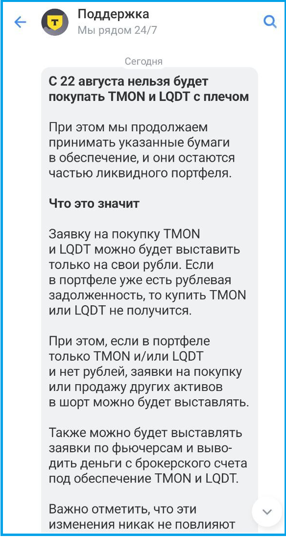 Т-Инвестиции начал рассылать уведомления, что теперь на заемные средства нельзя будет покупать фонды денежного рынка TMON и LQDT. По сути - это борьба с карусельщиками, которые открывали по 10 брокерский счетов, закидывали туда по 3000-4000 рублей и накупали фондов на 7000-8000 рублей. То есть фактически они покупали фонды денежного рынка на заемные, комиссию за это не платили, а прибыль при этом была их. Точные суммы тут писать не буду потому, что у данных фондов разные оценки риска, а отсюда и плечо. Но скажу так, Т-Банк позволяет уходить в минус на 5к по каждому брокерскому счету и не платить за это комиссию. Теперь нельзя выставить заявку на покупку этих двух фондов ликвидности, если на счете нет своих денег. То есть нельзя купить данные фонды на заемные средства. Если же в портфеле есть собственные средства, то паи можно приобретать как и раньше. Брокер заявляет, что ничего не будет делать с инвесторами, которые ранее купили эти 2 фонда на заемные. Я этим нововведением не очень до