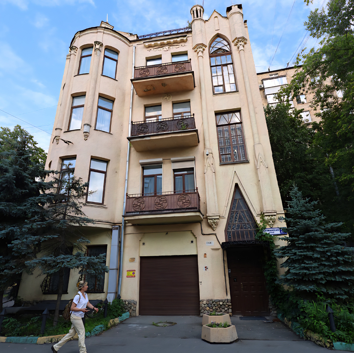 Пока я делал фотографии этого дома, моя жена стоя рядом, делала выводы. И один них таков: на Бауманской улице нужно поменять подвижной состав трамваев с современных Витязей на нечто старое и европейское. Ибо они портят атмосферу вокруг дома под номером 23. Это конечно же шутка, но дом построенный в неоготическом стиле в начале XX века, действительно создает ощущения того, что это улица - часть маленького европейского городка. Архитектор Виктор Мазырин построил этот дом для крестьянина Антона Фролова. Последний кстати к слову считался крестьянином лишь на бумаге, по факту являясь купцом. И данный проект впервые два года, как и планировал владелец, являлся доходным домом. Совсем скоро в России произошла революция и этот дом, как и огромное множество других, стали использовать как коммунальное жилье. Так, уютный готический шедевр состоящий из трех квартир, превратился в коммуналку, рассчитанную на 15 семей. В принципе, в начале прошлого столетия в Москве хватало готической архитектуры