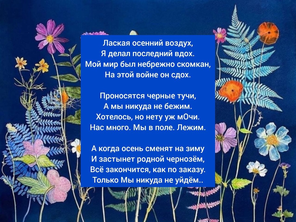 "ПОСЛЕ БОЯ" Лаская осенний воздух, Я делал последний вдох. Мой мир был небрежно скомкан, На этой войне он сдох. Проносятся черные тучи, А мы никуда не бежим. Хотелось, но нету уж мОчи. Нас много. Мы в поле. Лежим. А когда осень сменят на зиму И застынет родной чернозём, Всё закончится, как по заказу. Только Мы никуда не уйдём.. (Обломов, 2022) #стихотворение #сергейобломов #стих #поэзия #poetry #sergeyoblomov