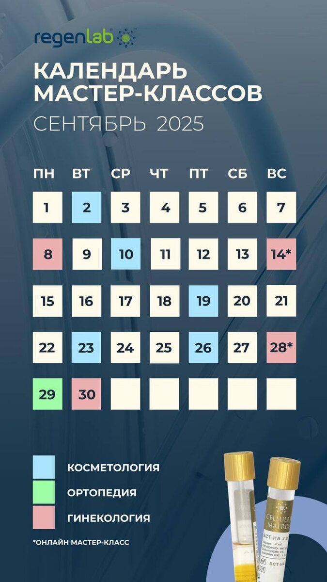 МАСТЕР-КЛАССЫ ПО ПРИМЕНЕНИЮ REGENLAB В СЕНТЯБРЕ За время мастер-класса по швейцарской методике аутологичного клеточного омоложения PRP RegenLab вы: 🍂узнаете о возможностях богатой тромбоцитами плазмы 🍂разберете инновационные направления клеточной терапии 🍂проведете процедуру PRP-терапии под руководством сертифицированного тренера RegenLab После мастер-класса мы остаемся с вами на связи, чтобы консультировать по всем вопросам и нестандартным ситуациям 💙 *для участия необходим диплом о высшем медицинском образовании Узнать подробнее здесь 📍г. Москва, ул. Новый Арбат, дом 31/12