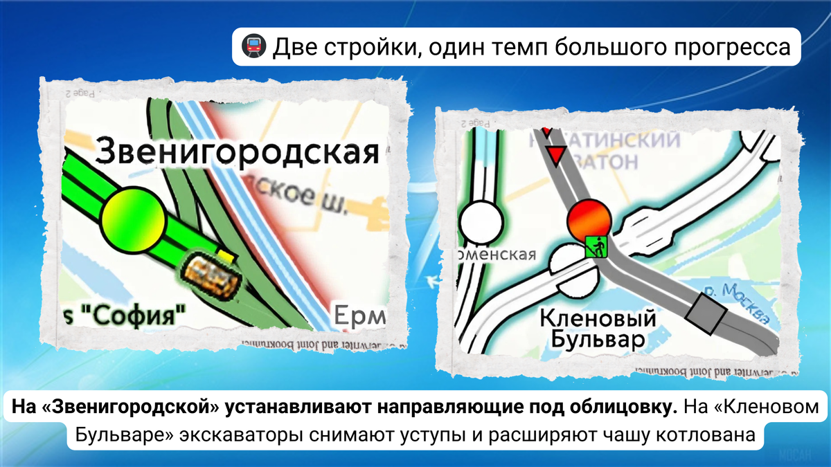 официальные отчеты. Давайте вместе разберемся, что же на самом деле происходит с нашей Москвой. Поехали? Во-первых, покажем 🚇 «Звенигородская» 💸 Рублёво-Архангельской линии. 📷 1.1: На путевых стенах платформенного зала станции начался монтаж направляющих под панели отделки. 📷 1.2: Вид на левый перегонный тоннель, взгляд в сторону 🚇 «Шелепихи». 📷 1.3-1.4: Вид с платформы на эскалаторный наклон восточного вестибюля (к ул. Шеногина). Во-вторых, окинем взором площадку 🚇 станции «Кленовый Бульвар» 🏭