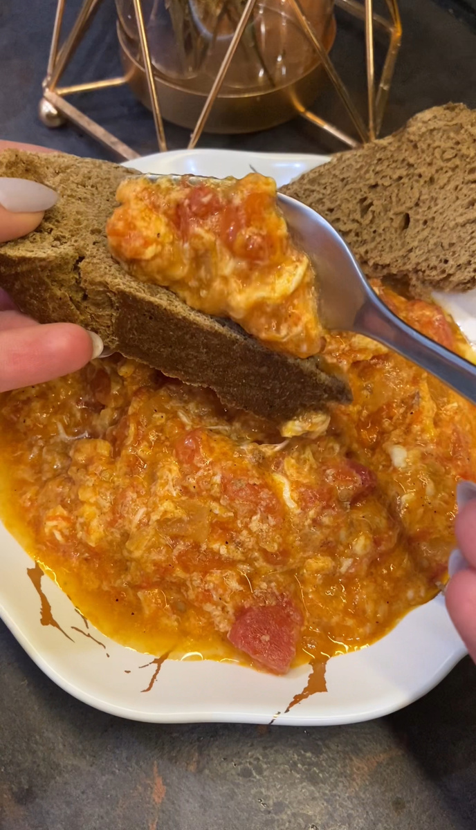 Дарю всем мой праздничный сборник рецептов и конструктор по сборке 1000+ салатов на каждый день! Переходи в мой ТГ канал и забирай❤️ https://t.me/lusine_karapett/49 Мой саааамый любимый завтрак, мама всегда его готовит, когда я приезжаю к ней в гости. Для меня это вкус детства. До сих пор помню, как летом мама накрывала для нас стол во дворе и мы садились с братом и сестрой завтракать🥹 Нам понадобится: ~ Помидоры 1 кг. ~ Лук 1 шт. ~ Яйца 4 шт. ~ Соль, чёрный перец по вкусу ~ Масло для жарки 30 мл. (У меня Гхи) Приготовление: Помидоры заливаем кипятком и очищаем от кожуры. Нарезаем кубиками. Мелко нарезанный лук обжариваем до золотистости и добавляем помидоры. Закрываем крышкой и тушим на среднем огне 10 минут, до почти однородного состояния. Но я люблю когда остаются кусочки помидоров. Солим, перчим, можно добавить немного сахара, чтоб уменьшить кислотность помидор. Яйца взбиваем вилочкой и заливаем помидоры, помешиваем медленно лопаткой, пока яйца не схватятся и вуаля!