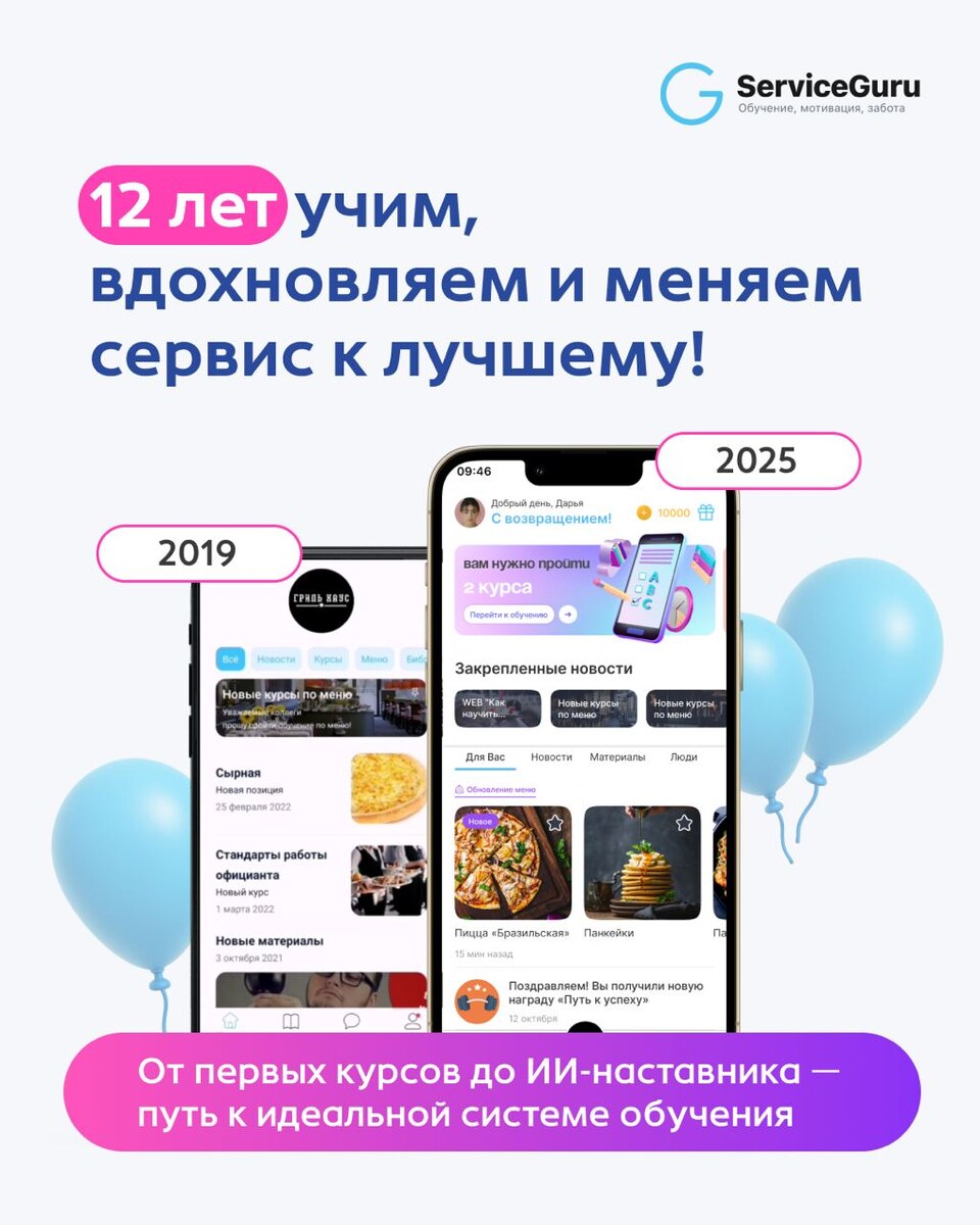 ServiceGuru исполняется 12 лет!🥳 Когда-то всё началось с одной идеи💡. Сергей Горбунов, будучи ресторатором, видел, как непросто и долго проходит обучение в оффлайне: кипы бумажных конспектов, отсутствие быстрых инструментов для проверки знаний, инструкции, развешанные на стенах. Было очевидно, что этот формат скоро перестанет работать, и ему на смену придёт мобильное обучение — доступное в любой момент, удобное и современное. Так и появилась ServiceGuru🚀 С тех пор мы прошли большой путь и уже 12 лет помогаем компаниям строить сильные команды и развиваем сферу гостеприимства✨. Мы совершенствуем платформу, чтобы у бизнеса была идеальная система обучения: понятная, гибкая и вдохновляющая сотрудников расти каждый день. Давайте вместе вспомним ключевые моменты нашей истории, которая только начинается 💪 Листайте карточки — там всё самое важное и тёплое ⬆️ Принимаем поздравления в комментариях и реакциях 💙