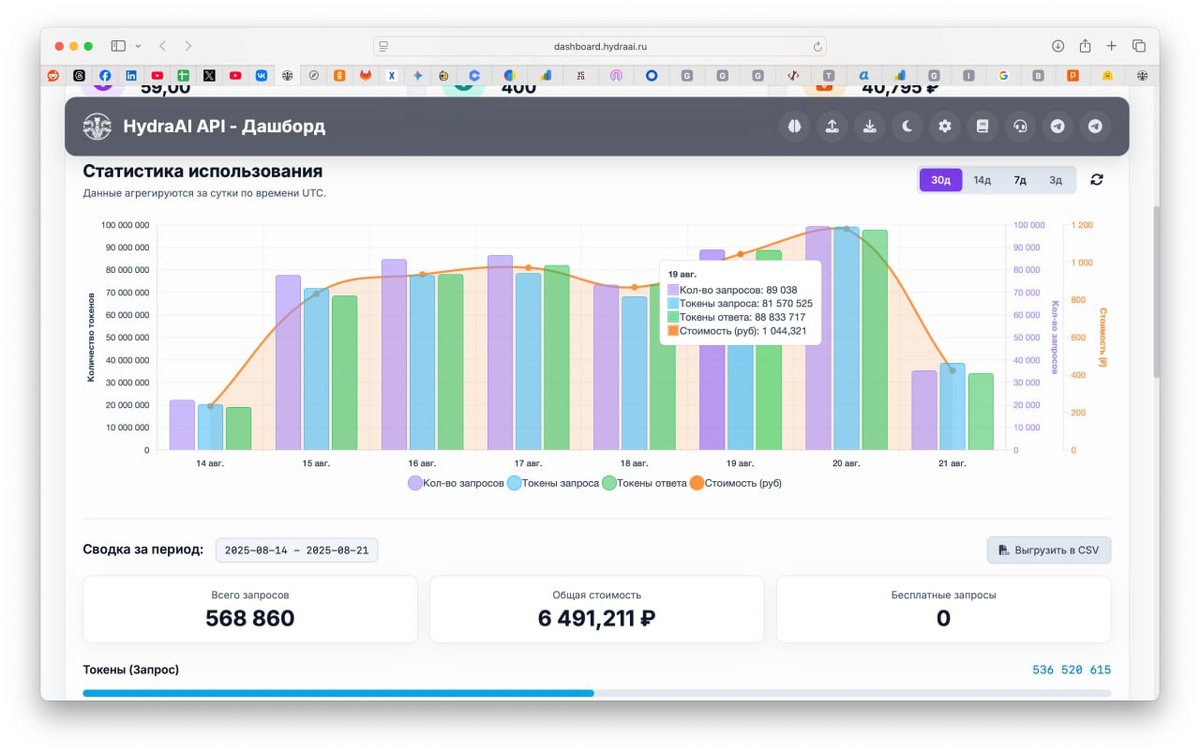 Наша статистика использования ИИ в бизнесе. На картинке - мы постепенно разгоняемся. Ребята делают полезный сервис доступа к ИИ по АПИ из РФ - вот здесь (ссылка реферальная, вам не сложно, мне приятно, всем полезно :)...