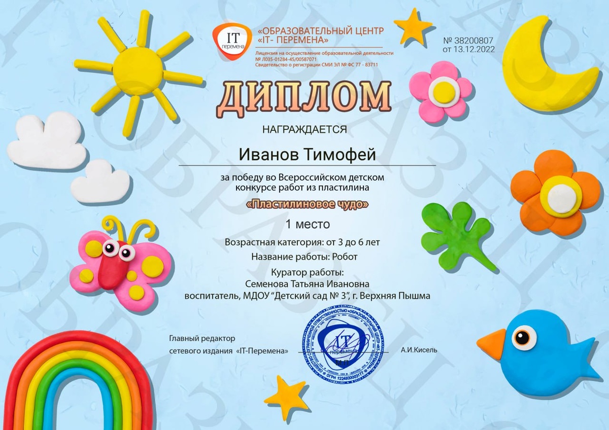 Мы подвели итоги бесплатного Всероссийского детского творческого конкурса "Пластилиновое чудо"! Результаты и наградные документы уже размещены в нашем новом поисковом телеграм-боте "Переменка": https://t.me/itperemenka_bot На сайте на странице результатов итоги будут опубликованы 25 августа в 8:00 по МСК. Заказать оригиналы наградных документов, напечатанных в высоком качестве на плотной бумаге, можно под соответствующим дипломом.