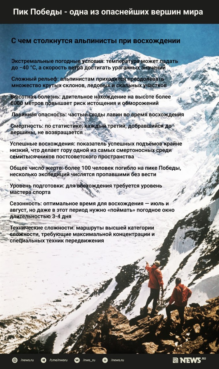 В ответ на пост Альпинистку Наговицину на опаснейшем в мире пике Победы ищут спасатели от организатора восхождения. МЧС Киргизии не участвует в поиске. Наталья с 12 августа выживает на горной вершине со сломанной ногой. По данным СМИ, спасатели от устроившей тур компании доберутся до россиянки через три дня. Сотрудников МЧС не привлекали из-за сложного рельефа местности — с ним смогут справиться только подготовленные профессионалы. С чем столкнутся все, кто решится отправиться на пик Победы — смотрите в нашей инфографике. ⭕️ Подписаться | Мы в MAX | Буст