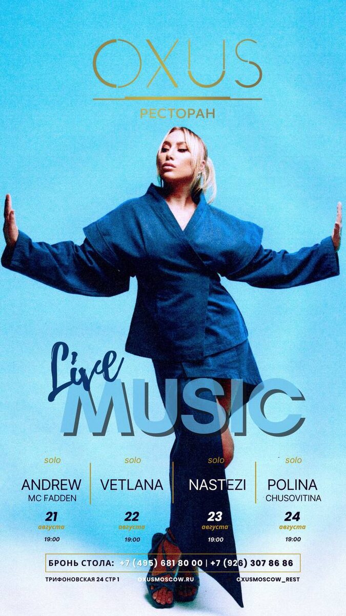 Мы и заметить не успели, как лето пролетело… Пока синоптики обещают осадки в крайние 10 дней лета, предлагаем прятаться от них в ресторане OXUS и слушать любимую музыку: 21.08 | четверг | 19:00 | ANDREW MC FADDEN | solo 22.08 | пятница | 19:00 | VETLANA | solo 23.08 | суббота | 19:00 | NASTEZI | solo 24.08 | воскресенье | 19:00 | POLINA CHUSOVITINA | solo Ресторан OXUS +7(495) 681 80 00 +7(926) 307 86 86 (WA/TG) Сайт, telegram