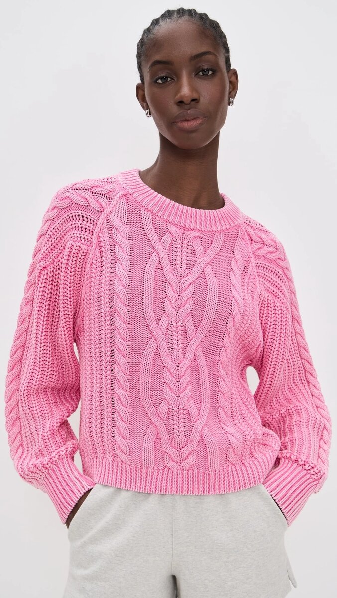 Нежно-розовый кардиган из хлопка и акрила отлично подчеркивает загорелую кожу, создавая мягкий и романтичный образ.