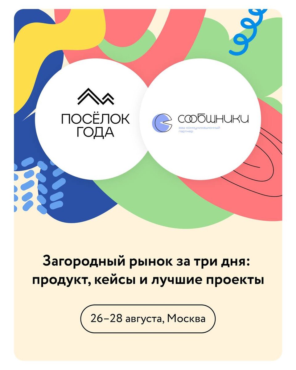 Три дня с премией «Посёлок года» – разберем полный цикл рынка 📒 Программа: 🟡26 августа – деловая программа «3 блока идеального загородного проекта: продукт, продажи, продвижение». В программе — разбор ключевых вопросов: как меняются продажи и спрос, что делать с растущей себестоимостью. В числе спикеров — Анна Комарова (ФСК Family), Ольга Магилина (VSN Group), Елена Тарасова (BN Group), Антон Алимов («Гранд Клязьма»), Илья Мочалов («Илья Мочалов и Партнёры»), Екатерина Артемьева (Сообщники), Роман Арапов (Duga Real Estate Branding), Екатерина Степанова (Kalinka Ecosystem) и другие. 🟡27 августа состоится тур по лучшим коттеджным поселкам Подмосковья. В маршруте — загородный семейный кластер «Мыс», коттеджный посёлок «Павловы Озёра», Wright Hills и «Ильинские холмы». 🟡28 августа — церемония награждения премии «Посёлок года». Здесь станут известны лидеры в номинациях «Посёлок с лучшей архитектурой», «Лучший курортный посёлок», «Лучшие проекты комфорт-, бизнес- и элит-класса» и
