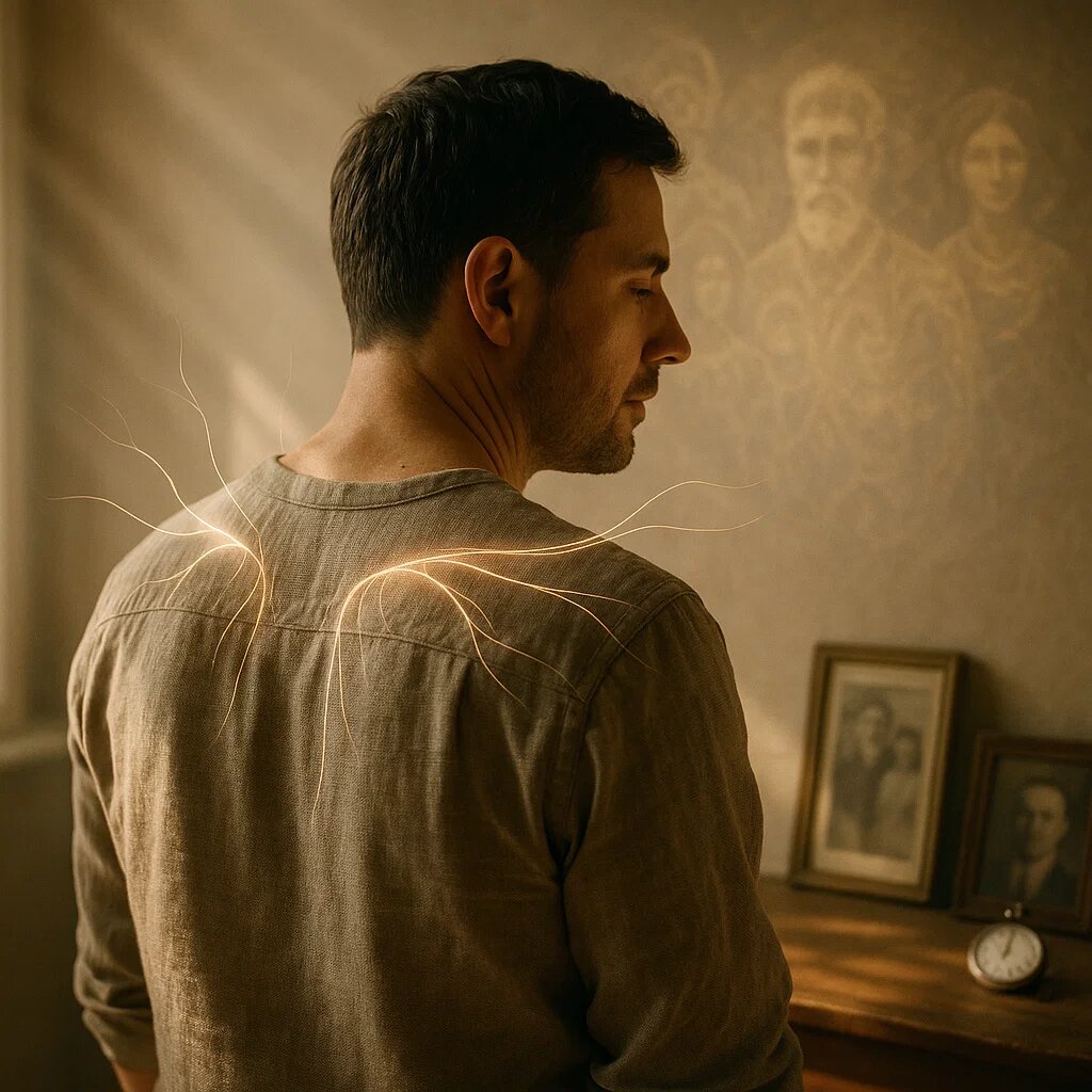 Мужчина А. пришёл с привычным набором: панические атаки, «каменные» плечи и спина, которая будто держит невидимый груз. Таблетки помогали как шумоподавление в наушниках — на время становилось тише, но источник шума никуда не девался. В спокойные периоды симптомы не исчезали, просто сидели в засаде. Мы начали с простого — с карты тела. Где сжимается? Когда накрывает? Что именно провоцирует волну? Диагностика показала классическую картину «памяти тела»: автоматические реакции, которые ум не успевает осознать, уже включают мышцы и дыхание. Подключили психогенетическую оптику: что в этой реакции — моё, а что может быть родовым эхом? Интересная закономерность проявилась не сразу, а где-то к середине работы: напряжение резче возрастало, когда разговор случайно касался дедушки. Словно кто-то поднимал рычаг тревоги из глубины. Мы аккуратно распаковали семейную историю — без драматизации, с уважением к фактам. Выяснилось: у деда был период жизни, насыщенный страхом и постоянной настороженностью