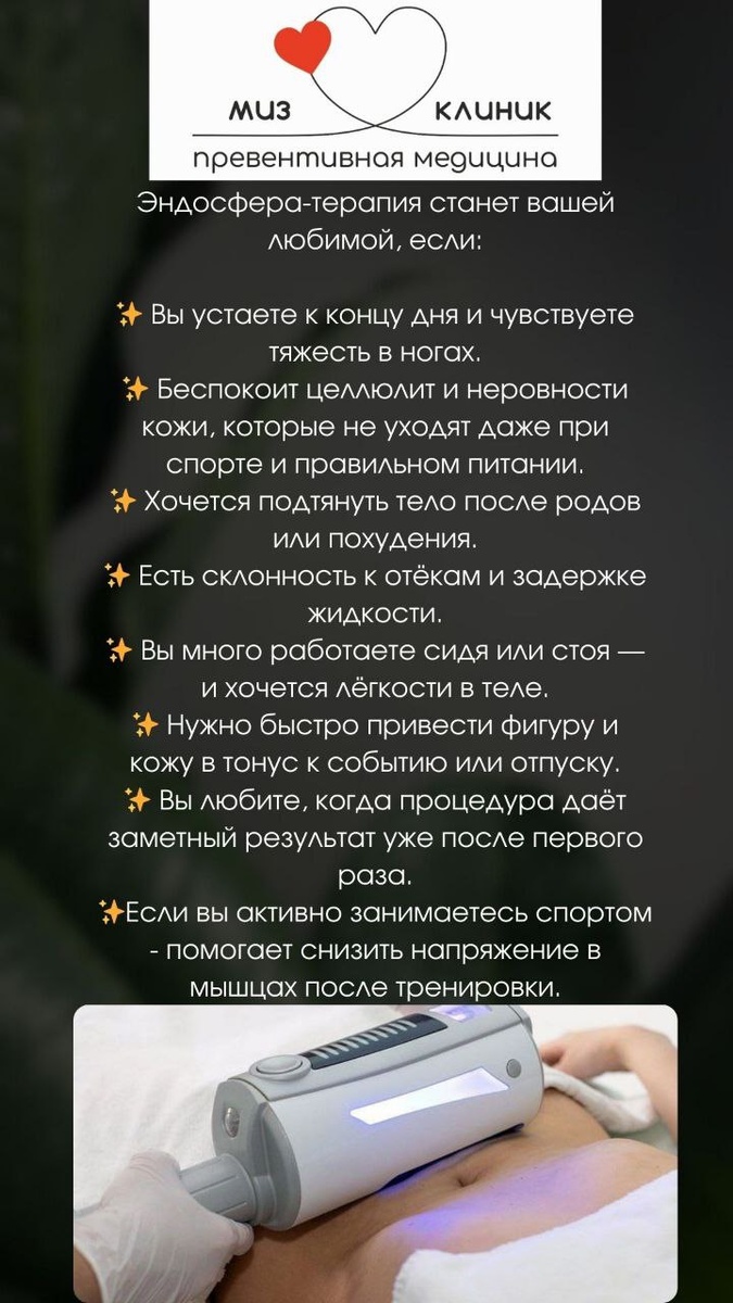 Кому точно понравится эндосфера? Эндосфера-терапия станет вашей любимой, если: ✨ Вы устаете к концу дня и чувствуете тяжесть в ногах. ✨ Беспокоит целлюлит и неровности кожи, которые не уходят даже при спорте и правильном питании. ✨ Хочется подтянуть тело после родов или похудения. ✨ Есть склонность к отёкам и задержке жидкости. ✨ Вы много работаете сидя или стоя — и хочется лёгкости в теле. ✨ Нужно быстро привести фигуру и кожу в тонус к событию или отпуску. ✨ Вы любите, когда процедура даёт заметный результат уже после первого раза. ✨Если вы активно занимаетесь спортом - помогает снизить напряжение в мышцах после тренировки. 8966-040-00-54 Улица Правды 2а Станция метро Белорусская