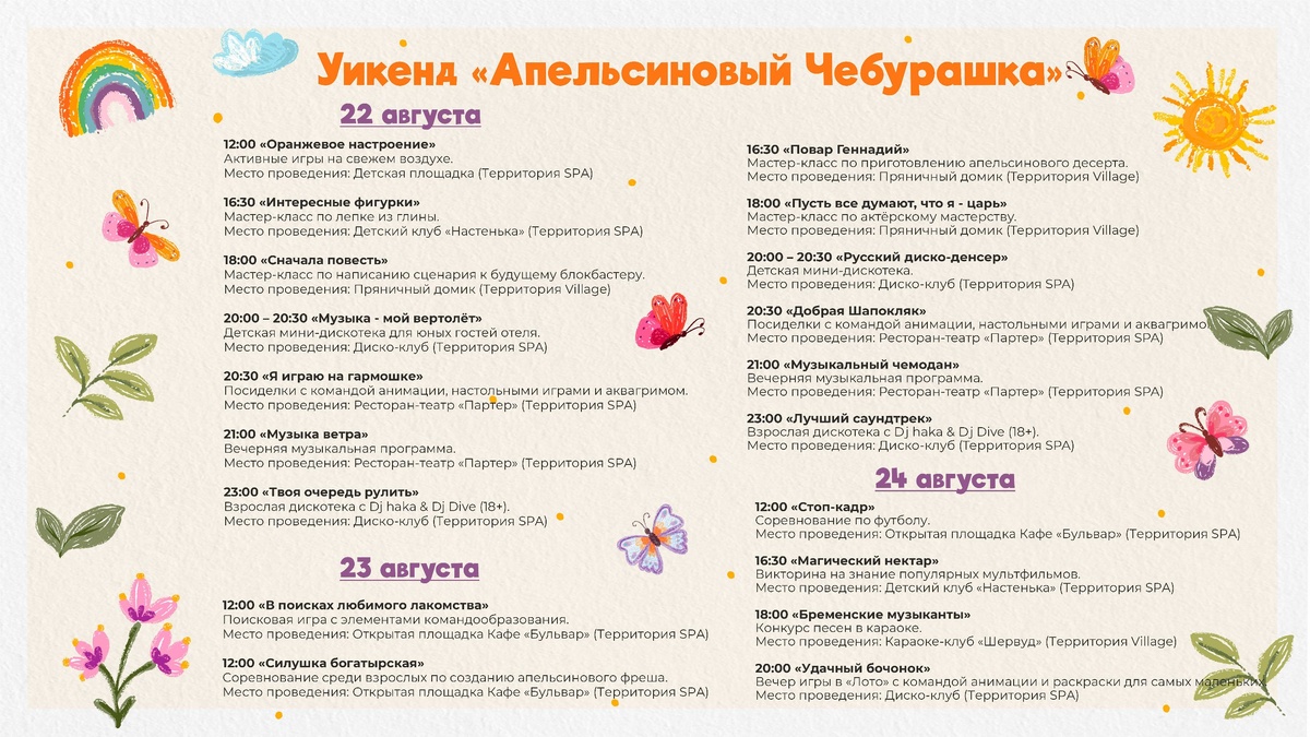 Программа анимации на уикенд "Апельсиновый Чебурашка" с 22 по 24 августа☀