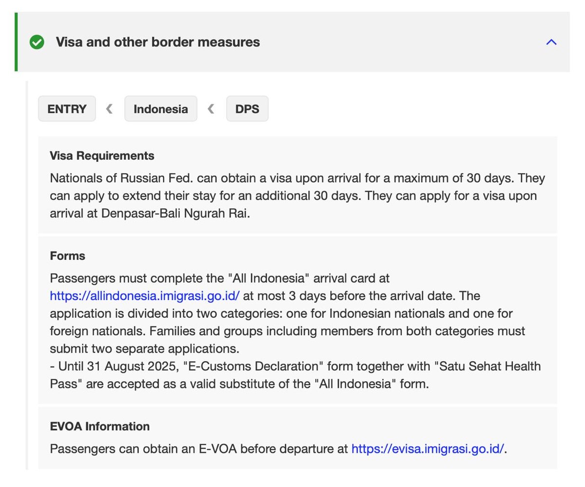 Индонезия вводит обязательную электронную декларацию для всех туристов! 🇮🇩 С 18 августа каждый въезжающий в Индонезию международным рейсом обязан заполнить электронную декларацию (E-CD) на новом портале не ранее чем за 3 дня до прибытия. 📋 В форме нужно указать личные данные, сведения о рейсе, а также задекларировать наличные, технику, продукты питания и другие товары. 📱 После заполнения вы получите QR-код — сохраните скриншот, так как интернет в аэропортах может быть нестабилен. ⚠️ До 31 августа ещё действует переходный период с возможностью использования старой декларации. 🛂 E-CD не заменяет визу — её仍需 оформлять отдельно онлайн или по прилёте. #Индонезия #ПравилаВъезда #Туризм @takeyourbackpack