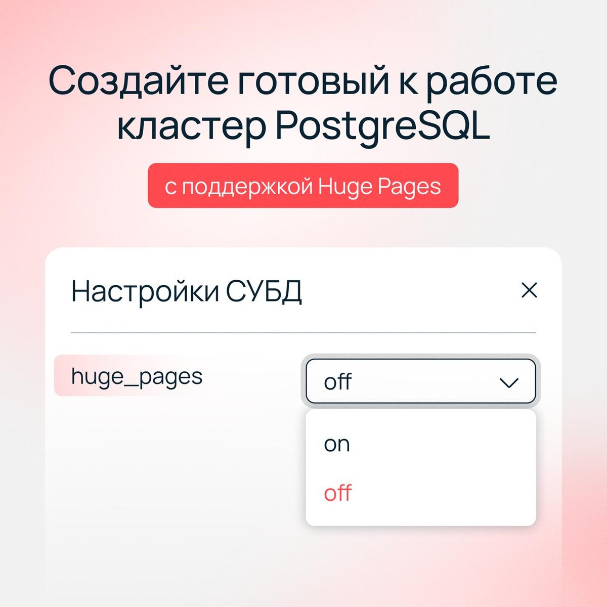 Управляйте параметром huge_pages в настройках кластеров PostgreSQL через интерфейс панели управления или API 🔝 Huge Pages позволяют оптимизировать производительность при работе с большими базами данных за счет: 👍 Снижения нагрузки на кеш процессора (TLB). Так вы можете сэкономить ресурсы для полезной работы, а не служебных вычислений, и увеличить скорость обработки запросов. 👍 Снижения нагрузки на CPU. Ядру операционной системы не нужно управлять множеством мелких страниц памяти. С включенной функцией huge_pages одна страница размером 2 МБ покрывает тот же объем памяти, что и 512 страниц по 4 КБ. 👍 Сокращения латенси. База данных будет стабильно работать даже под высокой нагрузкой. Создайте готовый к работе кластер PostgreSQL и настройте его под задачи вашего проекта ➡️