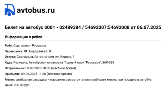 Билеты на автобус по маршруту Сортавала - Рускеала купили заранее, 6 июля, отправлялись 9 августа. Цена всего 200 рублей.